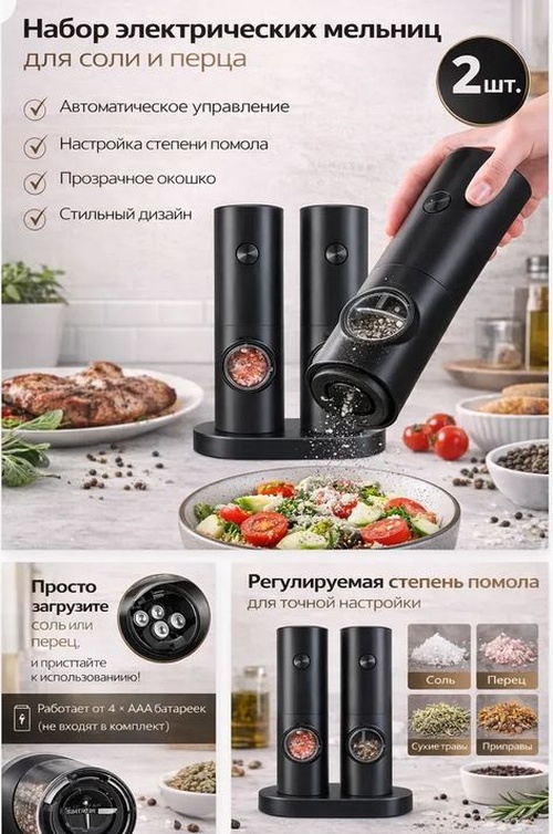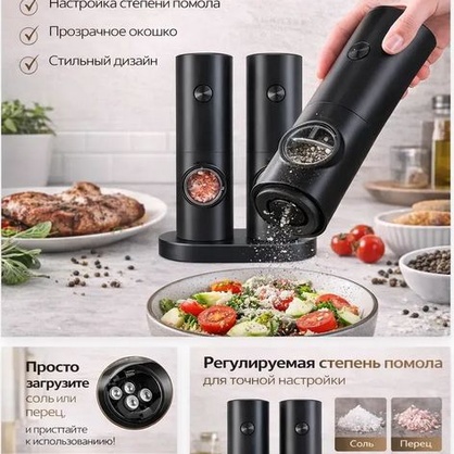 Набор электрических мельниц для специй (с подставкой, на батарейках, 2 шт.) Electric Grinder Set